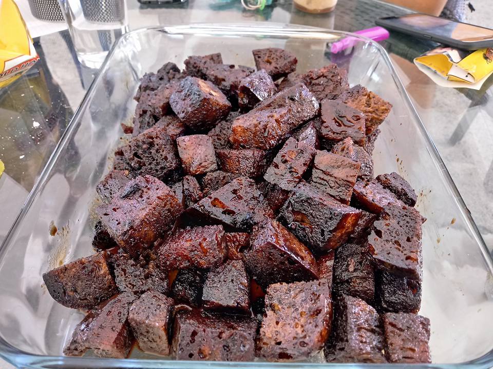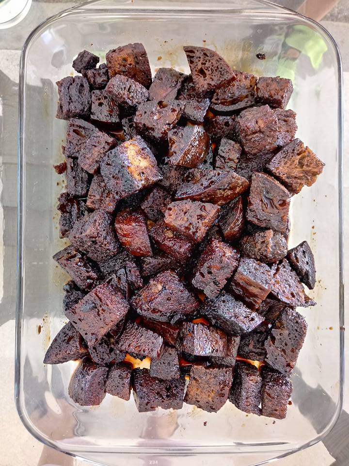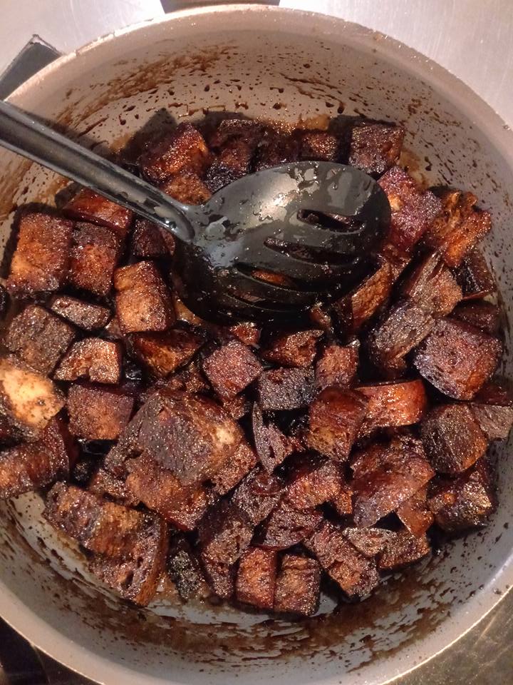 •Σβήνουμε την φωτιά και το περιχύνουμε με το χαρουπόμελο (όσο πιο πολύ βάλουμε τόσο πιο γλυκό γίνετε)