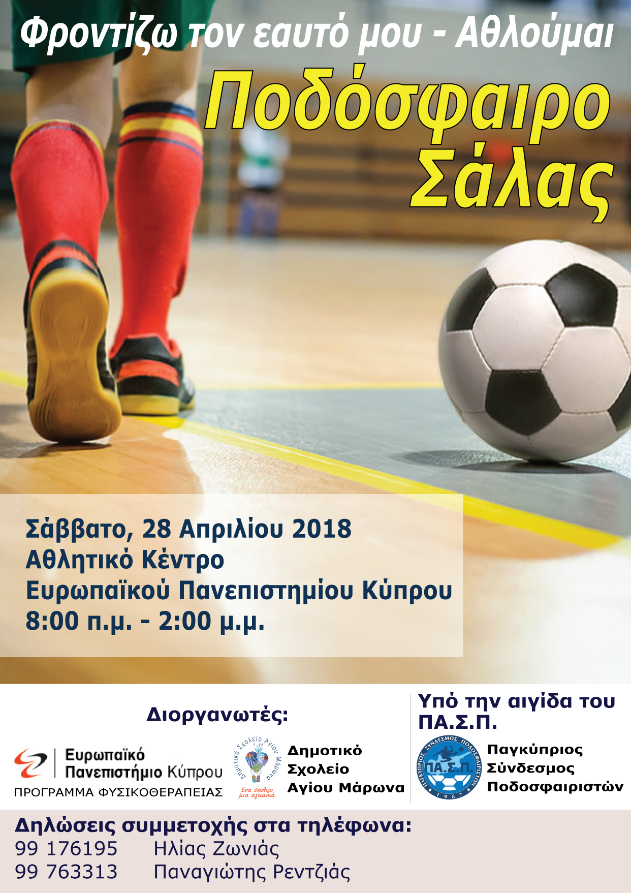 Το πρόγραμμα Φυσικοθεραπείας του Ευρωπαϊκού Πανεπιστημίου Κύπρου σε συνεργασία με το Δημοτικό Σχολείο Αγ. Μάρωνα, διοργανώνει τουρνουά Ποδοσφαίρου Σάλας, ως καταληκτική κίνηση, για τη δράση που λαμβάνει χώρα στο σχολείο τα τελευταία 2 χρόνια και έχει ως θέμα : Φροντίζω τον εαυτό μου – Αθλούμαι. Στη δράση αυτή, στόχοι ήταν η εκμάθηση της εργονομίας από τους μαθητές, η προσθήκη της άσκησης στη ζωή των μαθητών αλλά και η σωστή εκτέλεση αυτής.