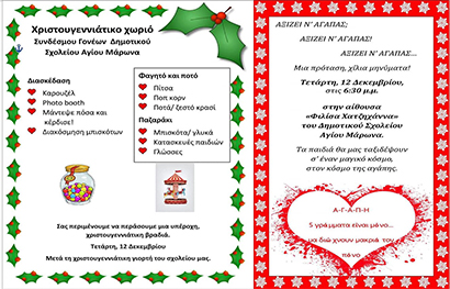Μετά την Χριστουγεννιάτικη γιορτή του σχολείου μας ο Σύνδεσμος Γονέων του Δημοτικού Σχολείου του Αγίου Μάρωνα διοργανώνει Χριστουγεννιάτικο χωριό. Θα υπάρχει για τη διασκέδαση Καρουζέλ, Photo Booth, Μάντεψε πός ακέδρισε . Επίσης θα υπάρχει φαγητά και ποτά όπως πίτσα, Ποπ κορν. Ποτά / ζεστό κρασί , Στο Παζαράκι θα έχει μπικότα / γλυκά , κατασκευές των παιδιών και πολλά άλλα .