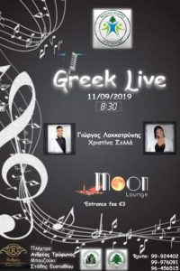 Την Τετάρτη 11/09/19, ώρα 20:30 , στο Moon Lounge Bar για ένα φανταστικό Greek Live, με τους Γιώργο Λακκοτρύπη και τη Χριστίνα Σελλά.