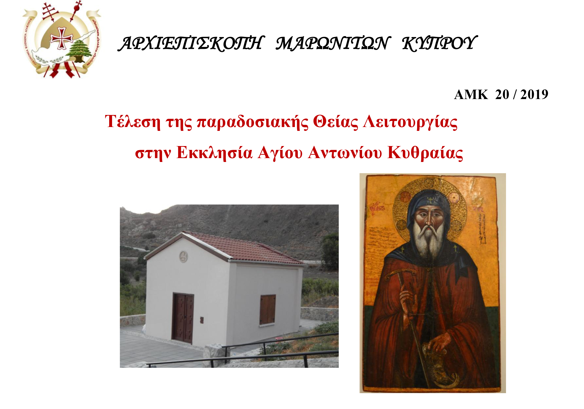Χοροστατούντος του Σεβασμιότατου Αρχιεπισκόπου Μαρωνιτών κ.κ. Ιωσήφ Σουέηφ η Θεία Λειτουργία για την Γιορτή του Αγίου Αντωνίου στην Εκκλησία του Αγίου Αντωνίου Κυθραίας θα τελεστεί την Δευτέρα 2 Σεπτεμβρίου 2019 στις 18.00.