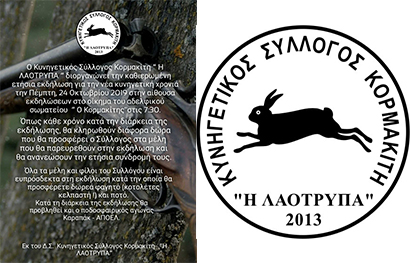 Ο Κυνηγετικός Σύλλογος Κορμακίτη “ Η ΛΑΟΤΡΥΠΑ “ διοργανώνει την καθιερωμένη ετήσια εκδήλωση για την νέα κυνηγετική χρονιά την Πέμπτη, 24 Οκτωβρίου 2019 στην αίθουσα εκδηλώσεων στο οίκημα του αδελφικού σωματείου “ Ο Κορμακίτης “ στις 7:30 μ.μ.
