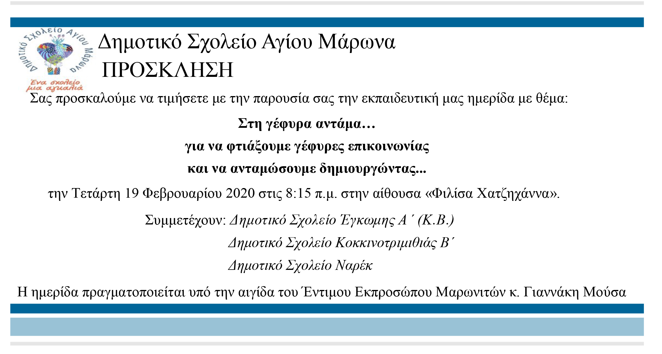 Το Δημοτικό Σχολείο Αγίου Μάρωνα διοργανώνει εκπαιδευτική Ημερίδα με θέμα : « Στη γέφυρα αντάμα… για να φτιάξουμε γέφυρες επικοινωνίας και να ανταμώσουμε δημιουργώντας…»
