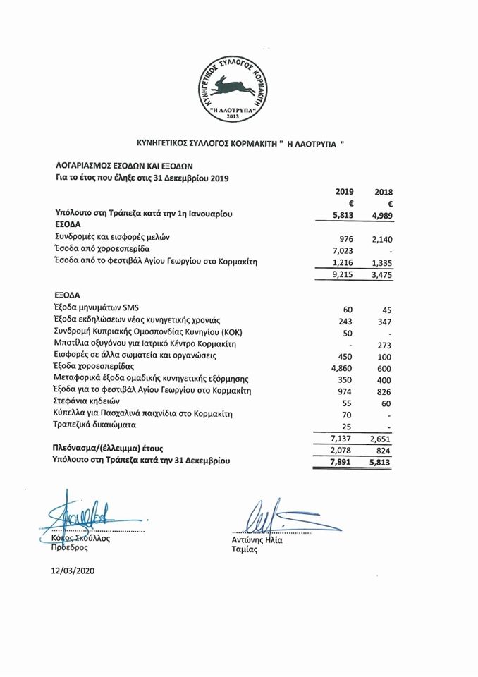 Για πλήρη ενημέρωση των μελών και φίλων του συλλόγου μας και όπως προνοεί ο περί Σωματείων και Ιδρυμάτων σχετικός νόμος για την ετοιμασία και υποβολή Οικονομικών Καταστάσεων στις αρμόδιες αρχές, δημοσιεύουμε σήμερα τους Λογαριασμούς Εσόδων και Εξόδων για το έτος 2019.