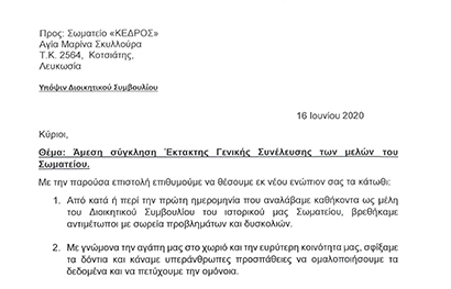 Με μεγάλη απογοήτευση, πικρία και αγανάκτηση παρατηρούμε ότι τις τελευταίες μέρες κυκλοφορεί σε συγκεκριμένη ιστοσελίδα καθώς και στα μέσα μαζικής δικτύωσης επιστολή, που με τις ανακρίβειες και την διατύπωση αναληθή γεγονότων, περιεχόμενο το οποίο απορρίπτουμε στην ολότητα του , σπιλώνουν το όνομα της πλειοψηφίας των μελών του ΔΣ του Κέδρου Αγ. Μαρίνας Σκυλλούρας.