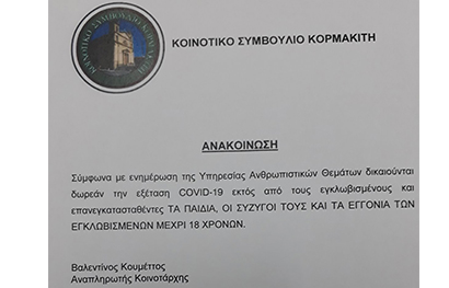 Σύμφωνα με ενημέρωση της Υπηρεσίας Ανθρωπιστικών Θεμάτων δικαιούνται δωρεάν την εξέταση COVID-19 εκτός από τους εγκλωβισμένους και επανεγκατεσταθέντες, ΤΑ ΠΑΙΔΙΑ, ΟΙ ΣΥΖΥΓΟΙ τους ΚΑΙ ΤΑ ΕΓΓΟΝΙΑ ΤΩΝ ΕΓΚΛΩΒΙΣΜΕΝΩΝ ΜΕΧΡΙ 18 ΧΡΟΝΩΝ.