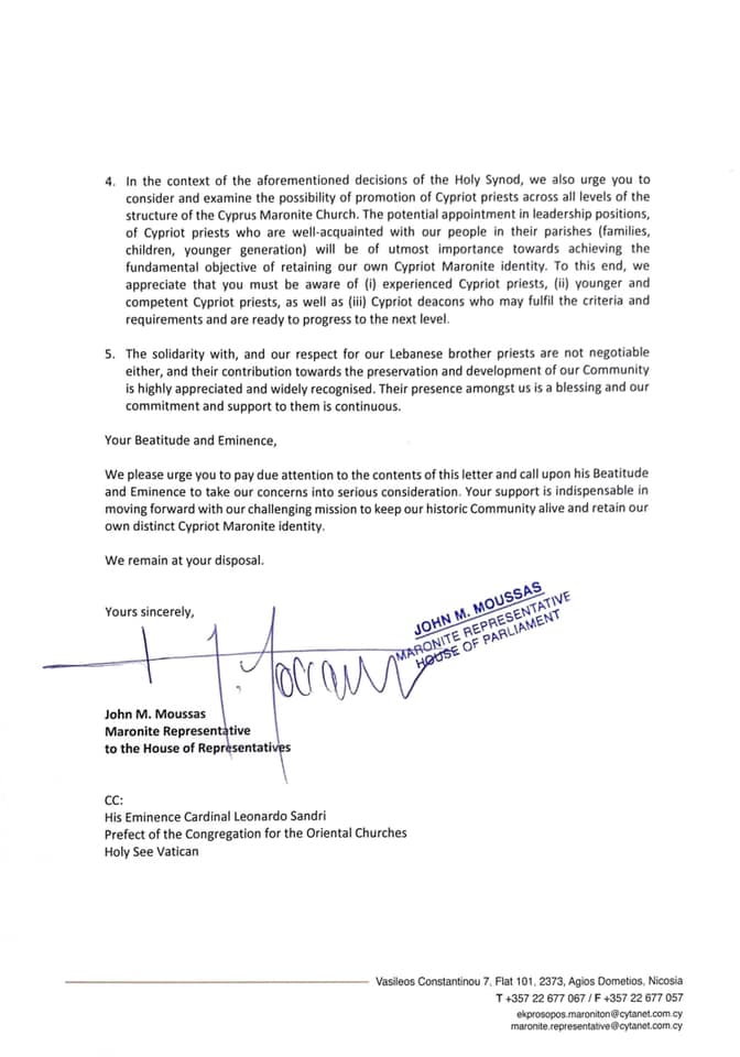 Θεώρησα καθήκον και υποχρέωση μου να θέσω ενώπιον του επικεφαλής της Μαρωνιτικής Εκκλησίας τις σοβαρές προκλήσεις που αντιμετωπίζουμε ως Κύπριοι Μαρωνίτες και του ζητώ όπως, στο πλαίσιο αυτών των εξελίξεων, λάβει σοβαρά υπόψη τις βάσιμες ανησυχίες μας και στηρίξει τον αγώνα που διεξάγουμε για επιβίωση με ταυτόχρονη διατήρηση της ιδιαίτερης Κυπριακής Μαρωνιτικής μας Ταυτότητας.