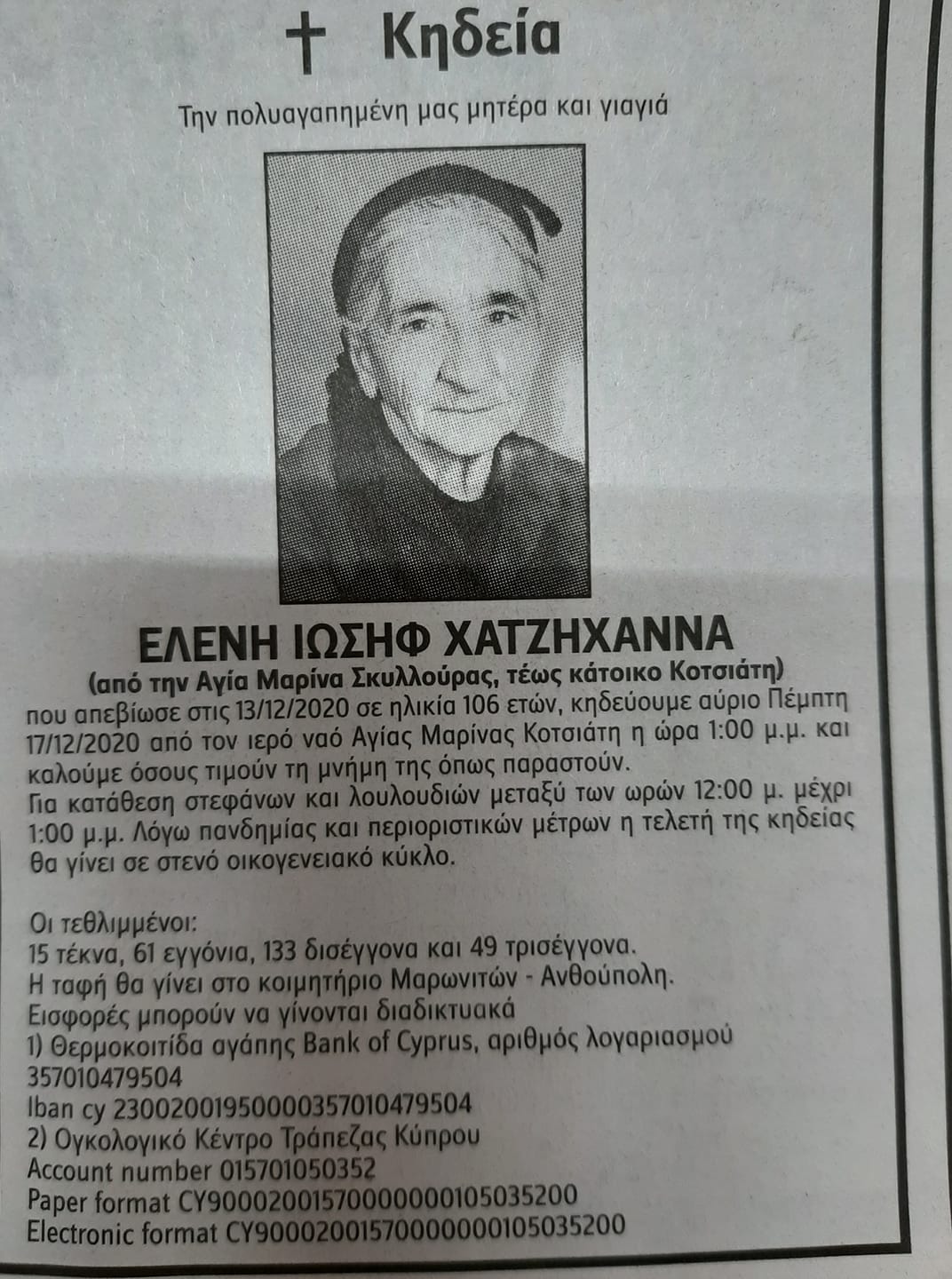 Αγγελία θανάτου και κηδείας Ελένης Ιωσήφ Χατζηχάννα από Αγία Μαρίνα Σκυλλούρας