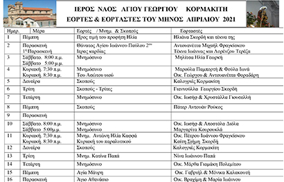 Εορτές και εορταστές Ιερού Ναού Αγίου Γεωργίου Κορμακίτη για το μήνα Απρίλιο 2021