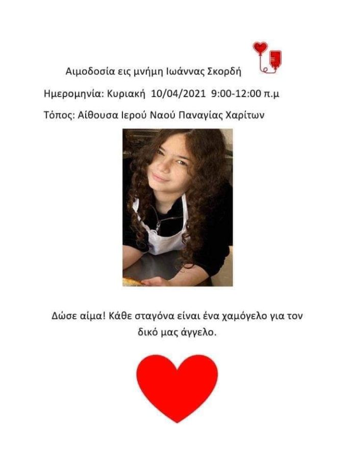 Βοήθησε να κυλήσει «κόκκινο» χρώμα καρδιάς στα χέρια μας, διάδωσέ το μήνυμα της εθελοντικής προσφοράς και χάρισε την δική σου σταγόνα αίματος και ένα χαμόγελο στην μικρή μας Ιωάννα Σκορδή.