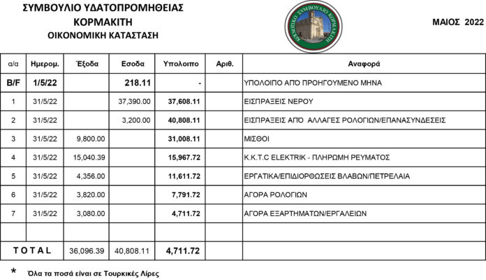 Έχει ετοιμαστεί από το Συμβούλιο Υδατοπρομήθειας Κορμακίτη η οικονομική κατάσταση για το μήνα Μάιο 2022. Σύνολο Εισπράξεων: 40590 Τ.L Σύνολο Εξόδων : 36096,39 T.L. Υπόλοιπο από τον προηγούμενο μήνα: 218,11 T.L. Υπόλοιπο για τον μήνα Μάιο 4711,72 T.L.