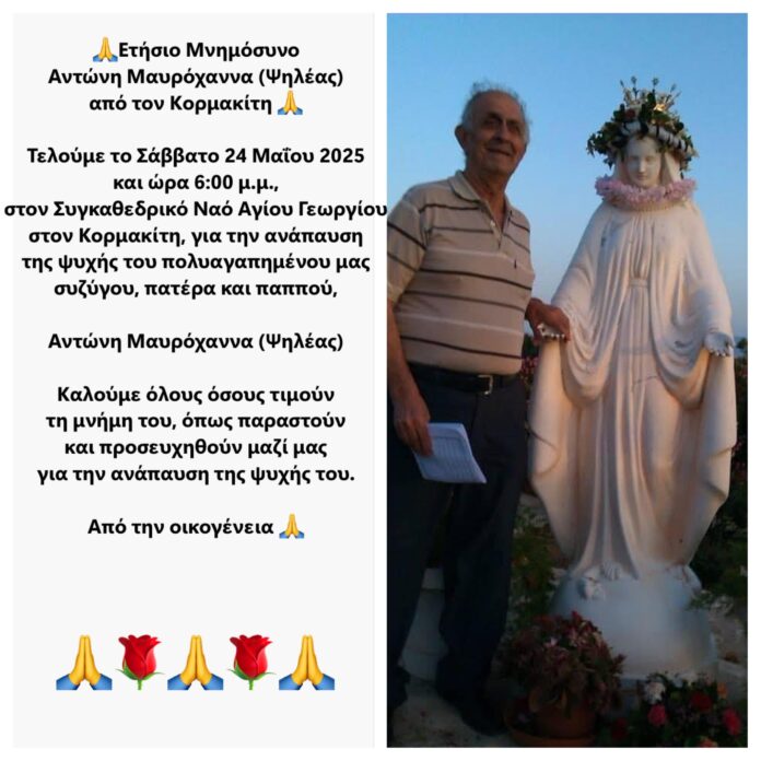 Τελούμε το Σάββατο 24 Μαΐου 2025 και ώρα 6:00 μ.μ., από το Συγκαθεδρικό Ναό Αγίου Γεωργίου στον Κορμακίτη, το ετήσιο μνημόσυνο για την ανάπαυση της ψυχής του πολυαγαπημένου μας συζύγου, πατέρα και παππού,