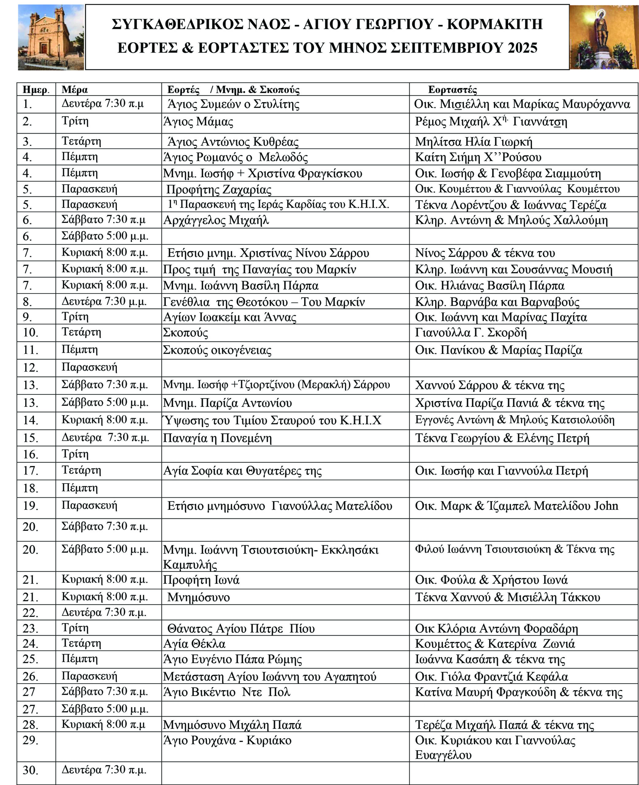 Εορτές και εορταστές Συγκαθεδρικού Ναού Αγίου Γεωργίου Κορμακίτη για το μήνα Σεπτέμβριο 2025