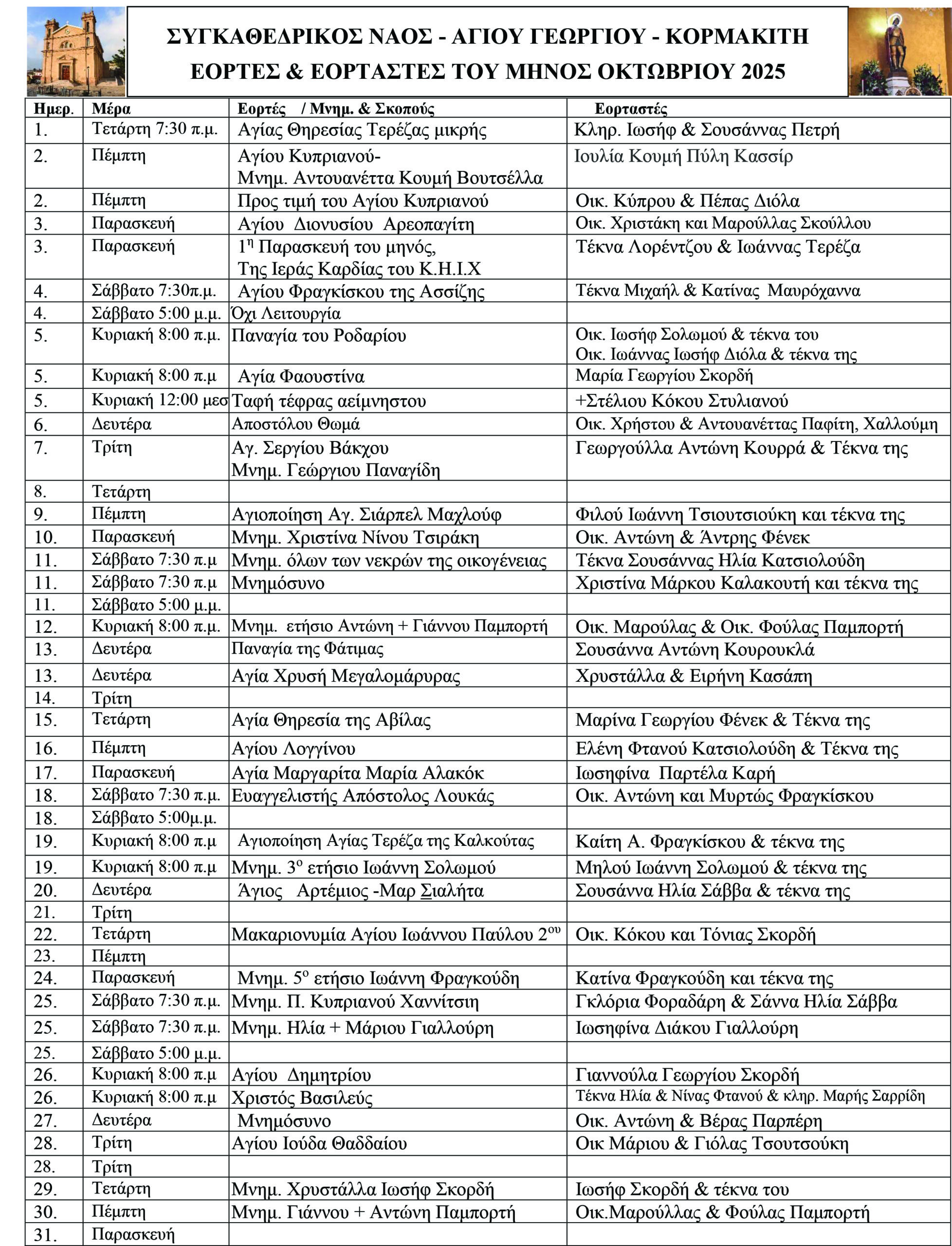 Εορτές και εορταστές Συγκαθεδρικού Ναού Αγίου Γεωργίου Κορμακίτη για το μήνα Οκτώβριο 2025