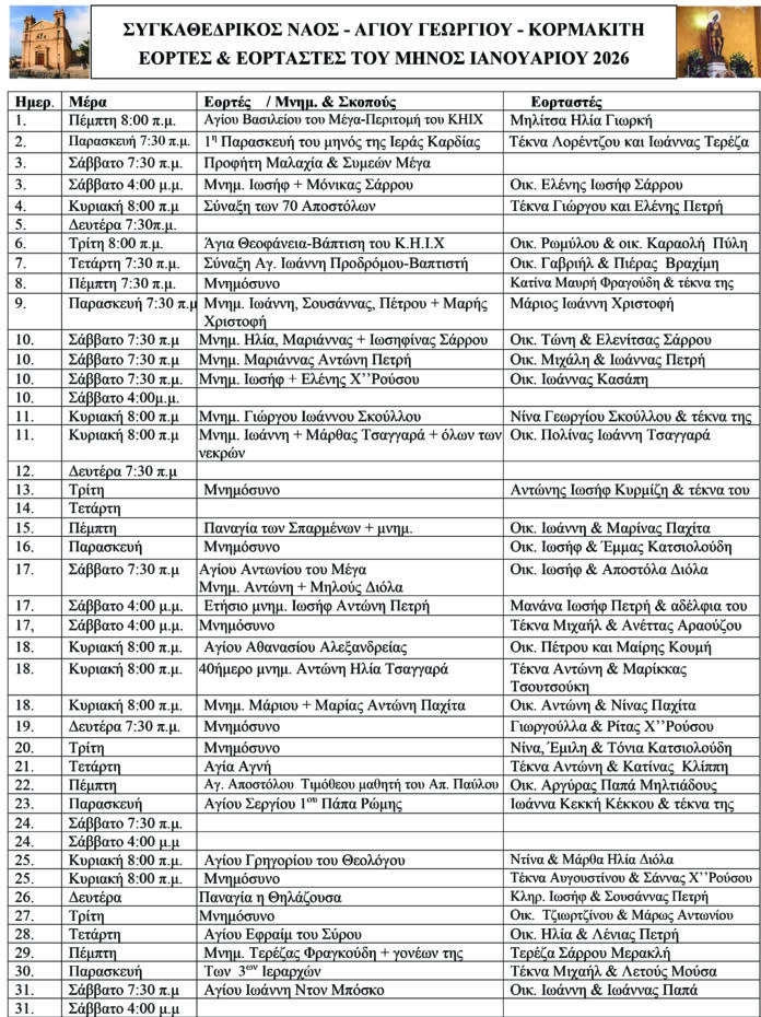 Έχει ετοιμαστεί από τον εφημέριο του Κορμακίτη Πάτερ Αντρέα Κατσιολούδη και το βοηθό του Ιωάννη Παχίτα το ενημερωτικό του Συγκαθεδρικού Ναού του Αγίου Γεωργίου Κορμακίτη για το μήνα Ιανουάριο του 2026.