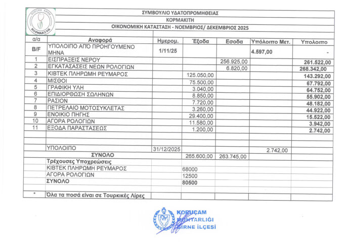 Συμβούλιο Υδατοπρομήθειας Κορμακίτη – Οικονομική κατάσταση Νοεμβρίου – Δεκεμβρίου 2025.