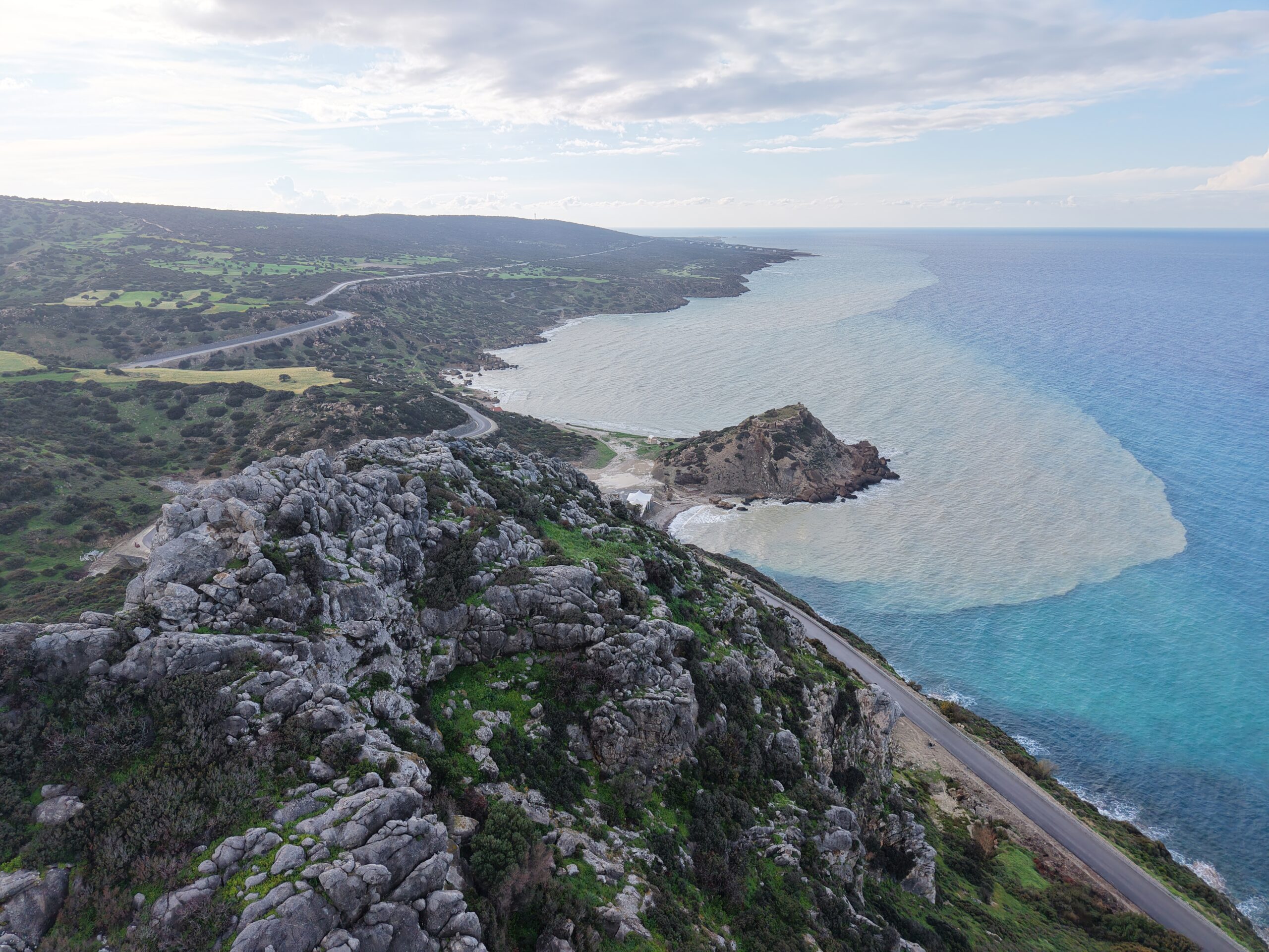 Τα βόρεια παράλια του Κορμακίτη από το βράχο της Γαλούσας. Διάφοροι χρωματισμοί της θάλασσας αλλά και της στεριάς.